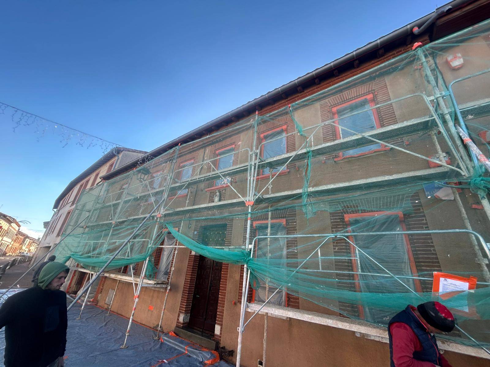 Le chantier a débuté par une mise en sécurité complète de la zone de travail grâce à l’installation d’un échafaudage conforme aux normes en vigueur. Cette étape essentielle a permis d’intervenir sur l’ensemble des surfaces en toute sécurité et avec une grande précision. Les supports ont ensuite fait l’objet d’une préparation approfondie : nettoyage des façades, décapage des zones fragilisées, lavage soigné et traitement spécifique contre les micro-organismes. Les fissures existantes ont été reprises afin d’assurer la pérennité du futur revêtement.